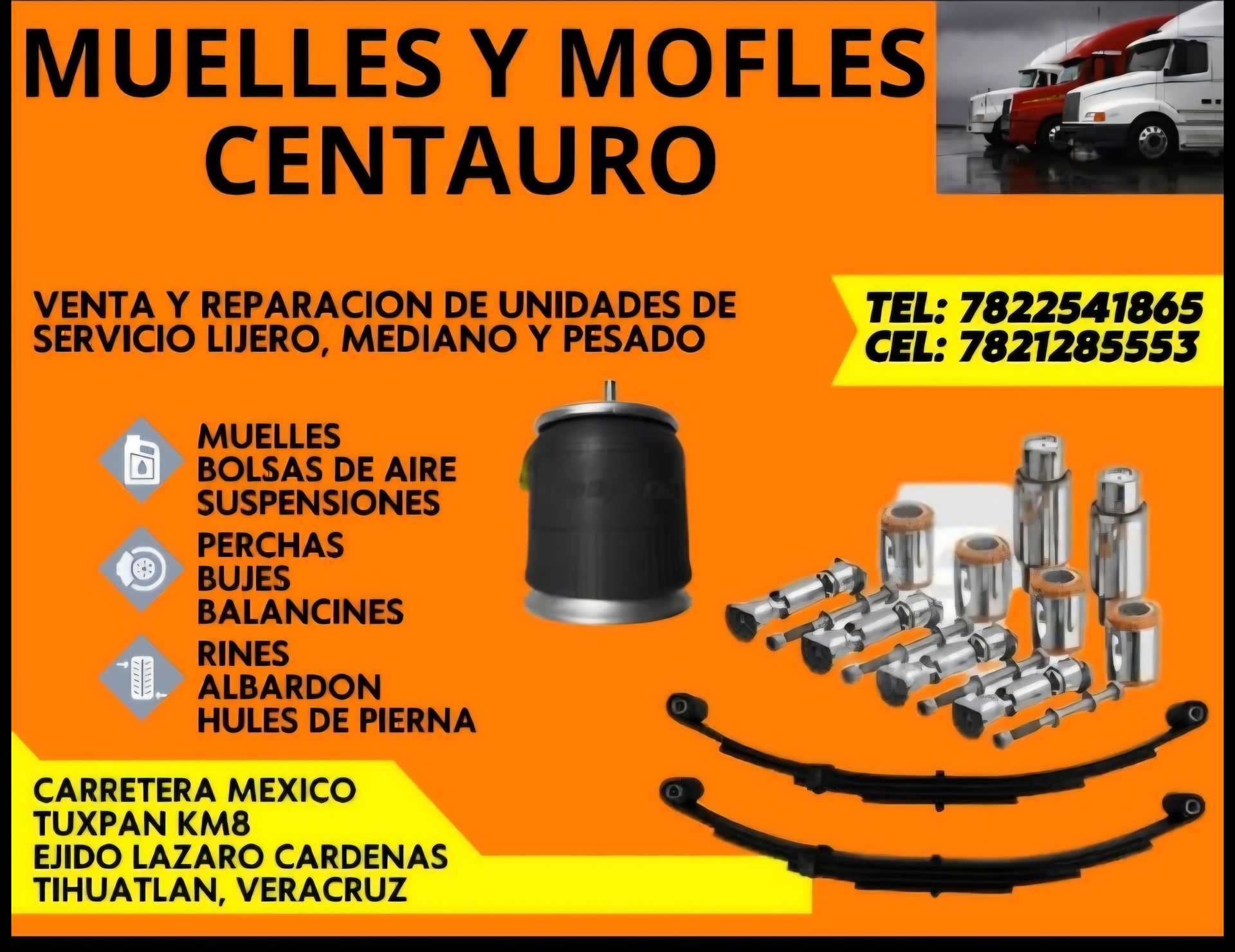 Muelles y Mofles Centauro es una empresa mexicana especializada en Muelles y Mofles en Tihuatlán, Veracruz enfocada en el mantenimiento automotriz profesional de sistemas de suspensión y escape. Con 12 años de experiencia, atendemos vehículos particulares, camionetas y camiones, ofreciendo soluciones confiables, precios competitivos y resultados duraderos para clientes de Tihuatlán, Veracruz y zonas aledañas.